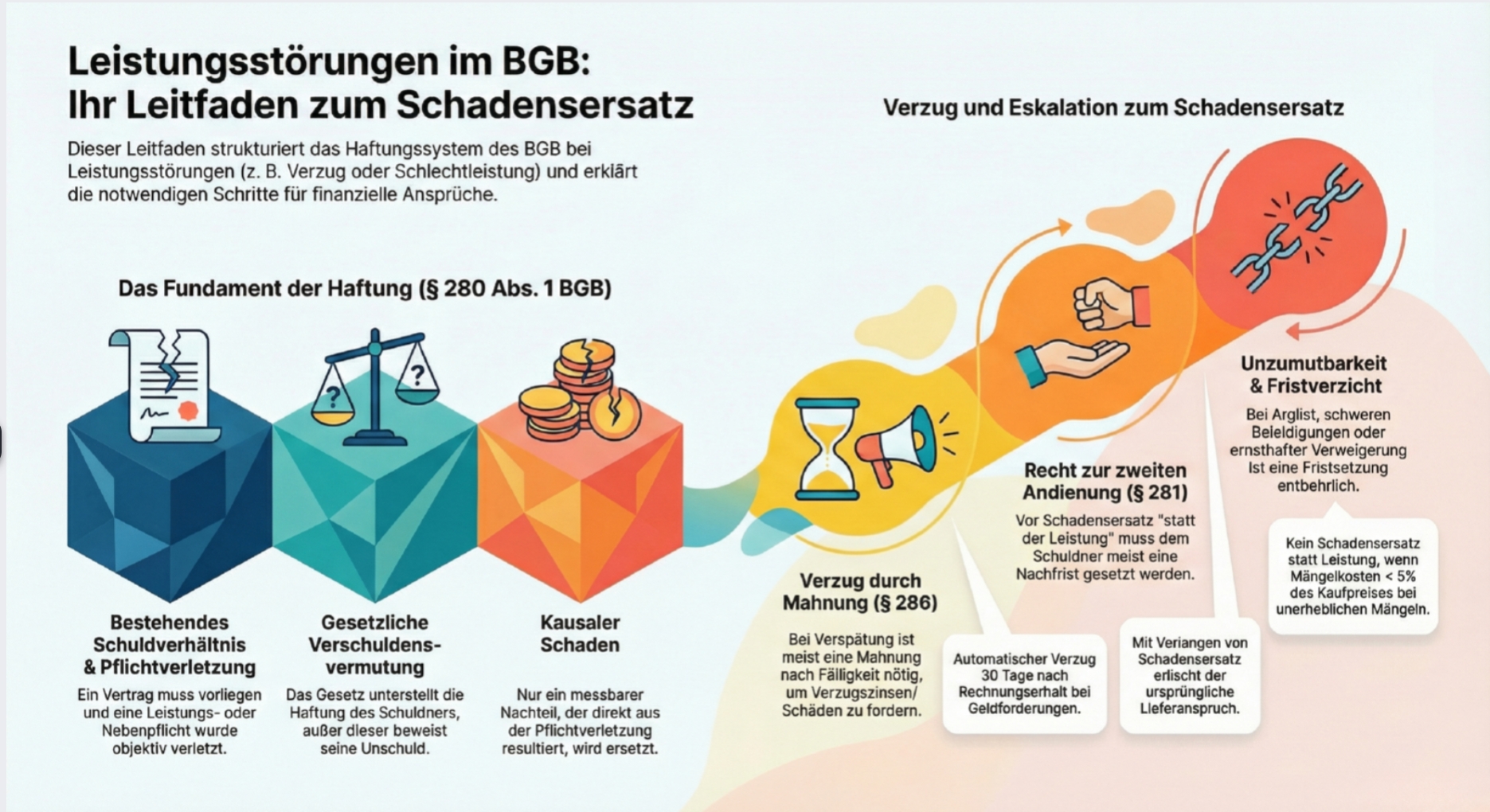 Im wirtschaftlichen Verkehr stellt die Verlässlichkeit von Verträgen die unumstrittene Basis jeder seriösen Kalkulation dar. Dennoch sind Leistungsstörungen – ob durch Verspätung, mangelhafte Ausführung oder das vollständige Ausbleiben einer Lieferung – ein fester Bestandteil der täglichen Realität. Das Bürgerliche Gesetzbuch (BGB) hält für diese Fälle ein präzises Instrumentarium bereit, um die Interessen der Vertragspartner zu schützen und einen gerechten finanziellen Ausgleich sicherzustellen.